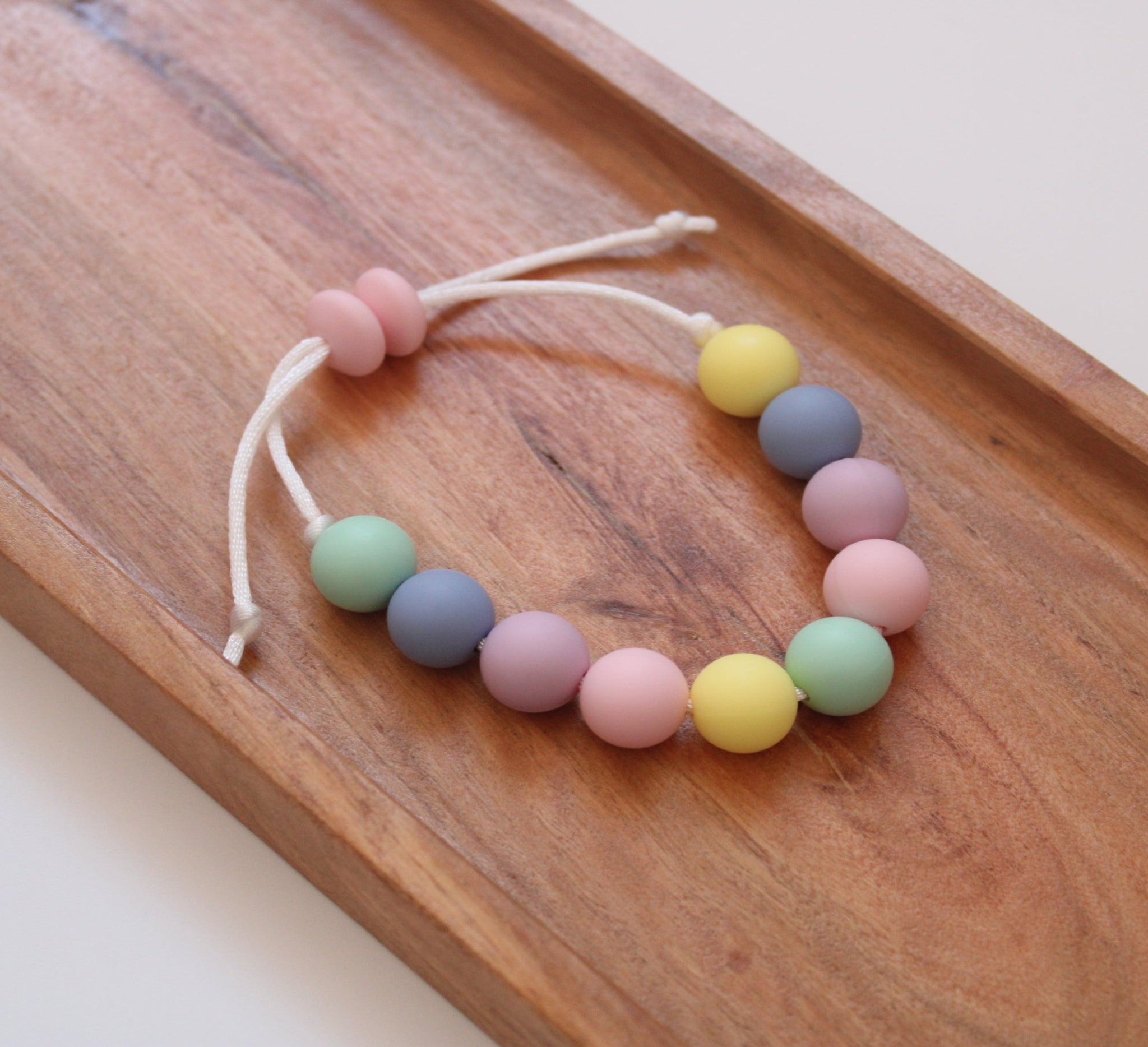 Adjustable silicone kid/ adults bracelets. Bracelets are made with mixture of silicone beads on a nylon cord. The bracelet can be worn loose or snug on wrist.
